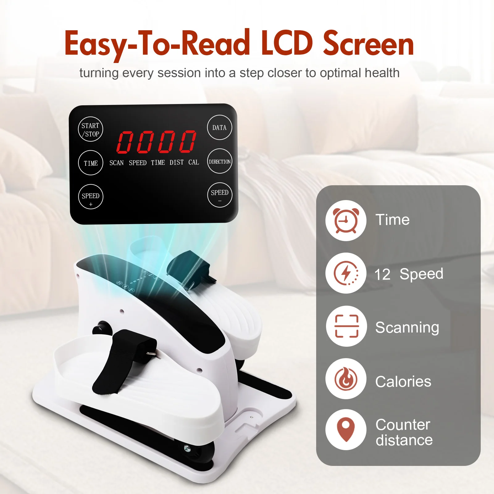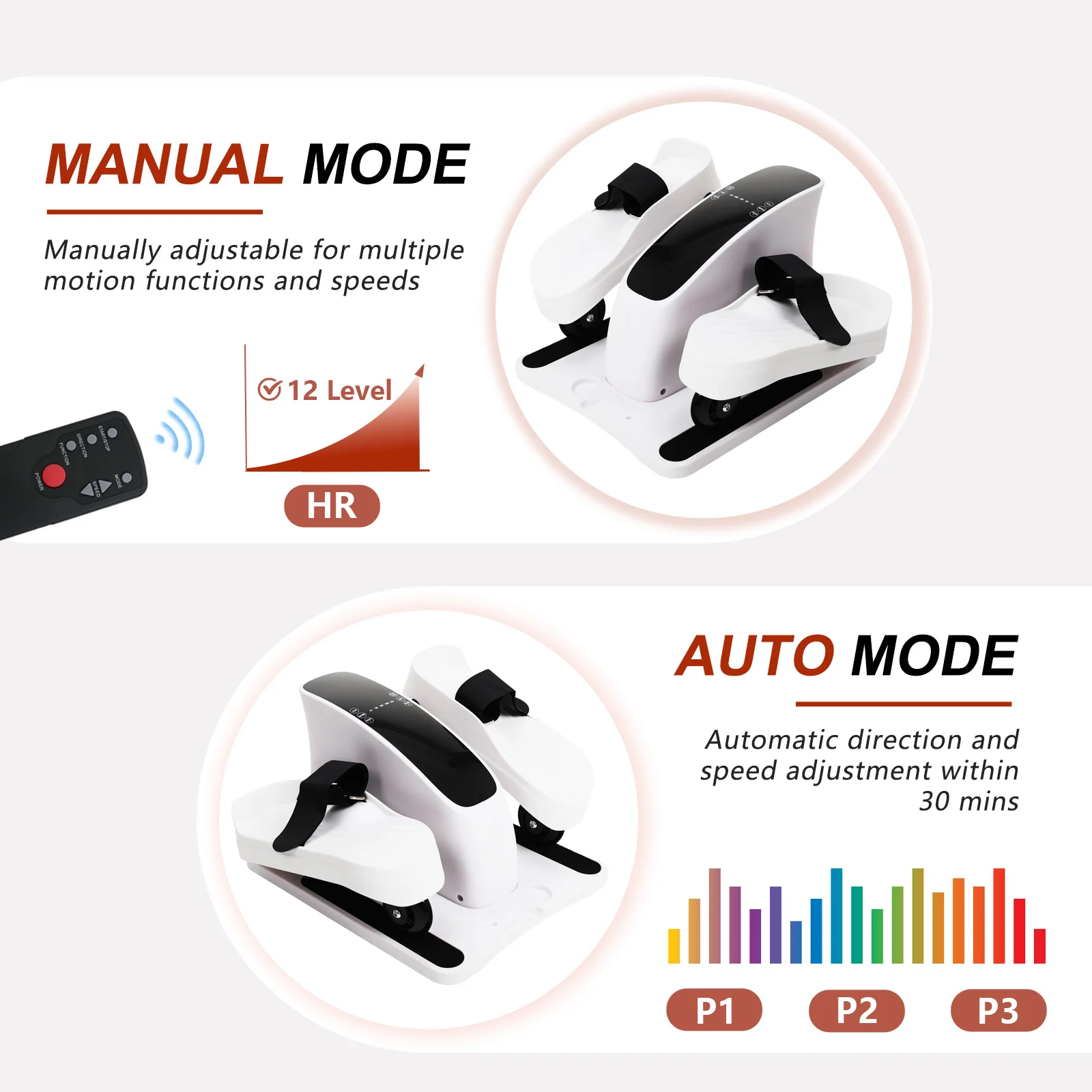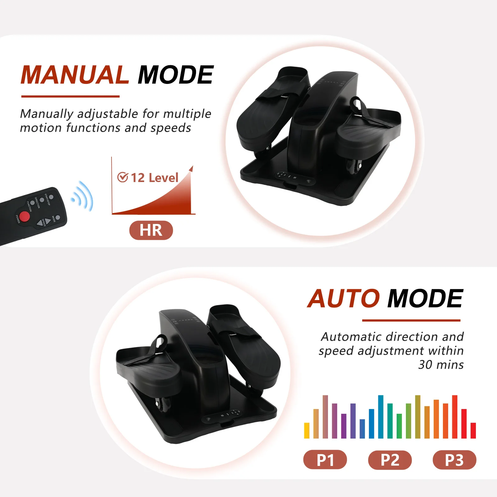 【Dual-Mode Flexibility for Any Situation】This elliptical seamlessly blends electric and manual modes. Plug it in for smooth, electric-assisted motion, with easy switching to P1-P3 automatic modes for simple and efficient workouts. Even without power, switch effortlessly to manual mode, with 12 adjustable speed levels (ranging from 1.5KM/h to 4KM/h) to meet your desired intensity, making every step a challenge and triumph.